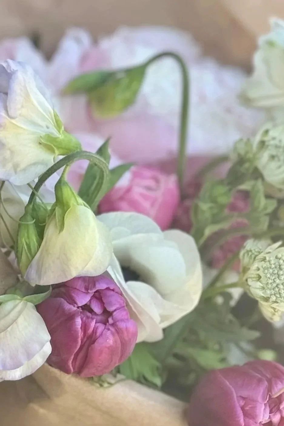 Late Spring delights in Peonies, Ranunculus, and oh-those-Sweet Peas.